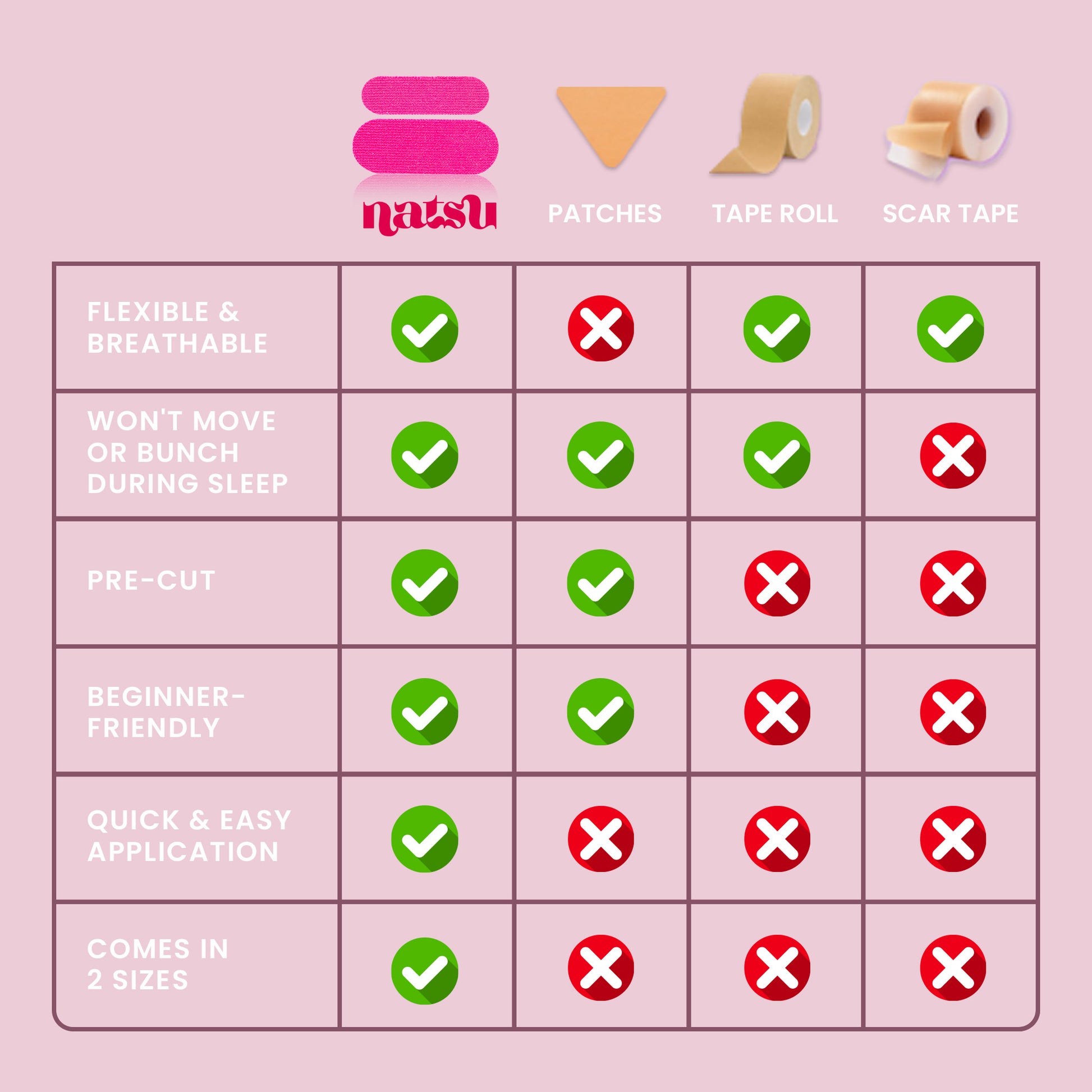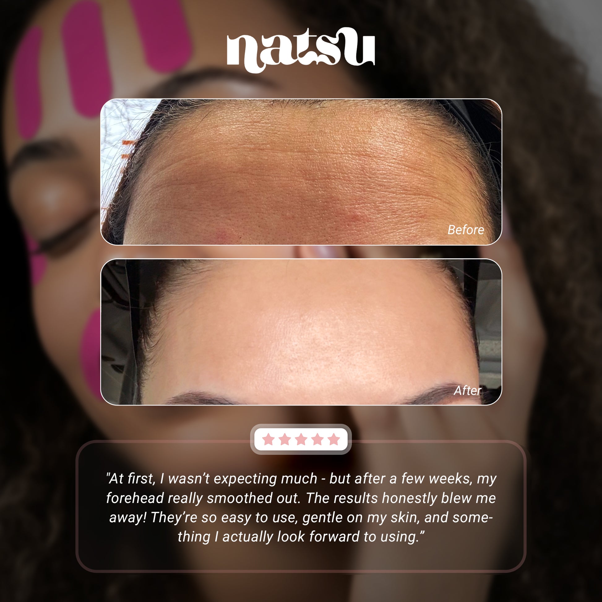 Natsu Face Tape is specifically engineered for anti-wrinkle support: it’s breathable, flexible, and made to gently lift the skin and relax facial tension overnight. It also adheres properly over skincare and stays put through movement and moisture, which silicone tape isn’t designed to do.